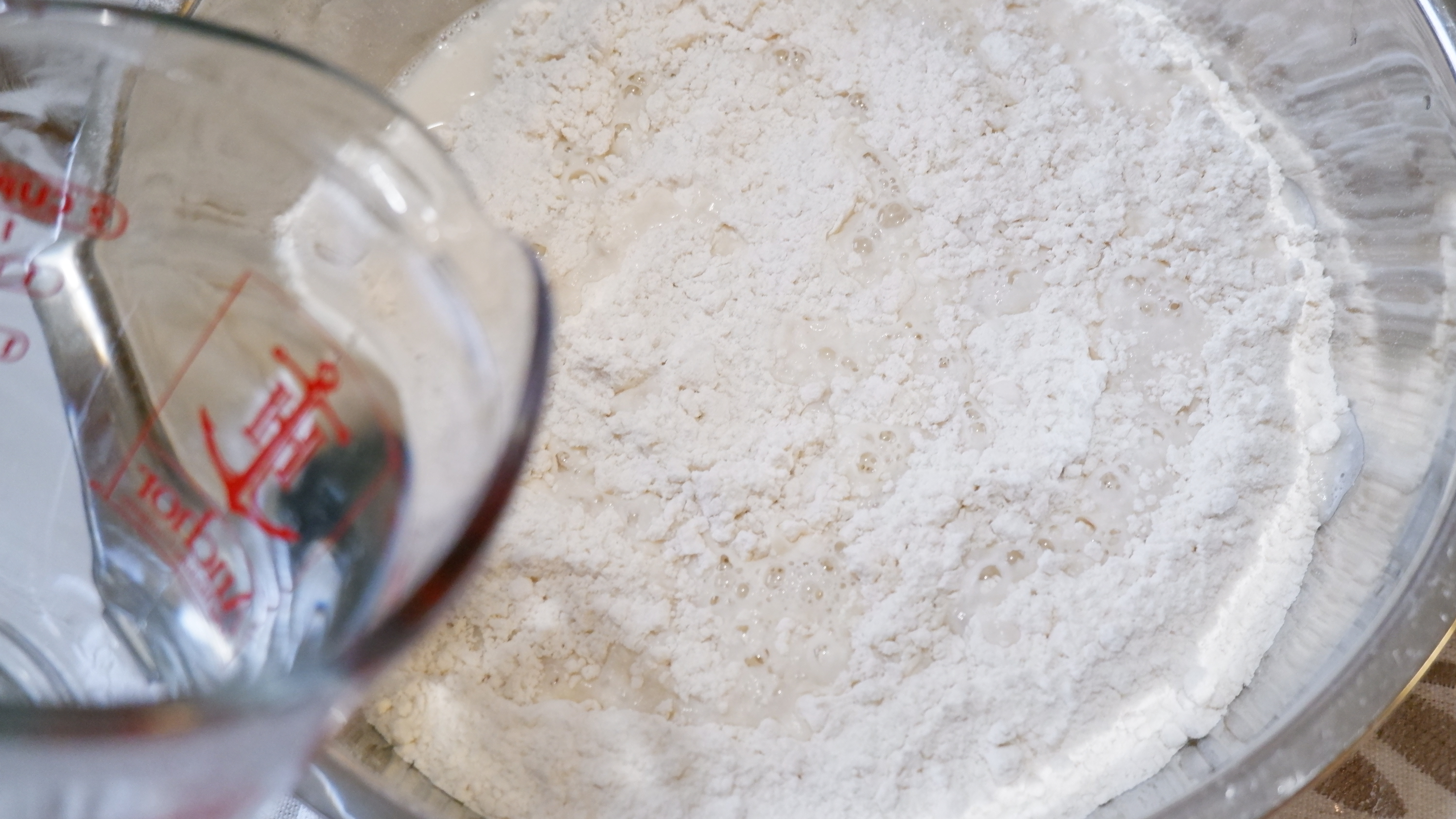1. 자! 재료가 준비 됬으면 반죽할 볼에 밀가루 6컵 (종이컵 가득) , 소금 반 큰 술을 뜨거운 물 (400ml)에 넣고 소금물을 만든 후 조금씩 부어주면서 반죽해줍니다. (제가 밀가루를 가득 담지 않은 이유는 제가 가지고 있는 계량컵이 한국 종이컵보다 커서 한국 종이컵 크기에 맞게 밀가루 6컵을 넣어줬어요!)