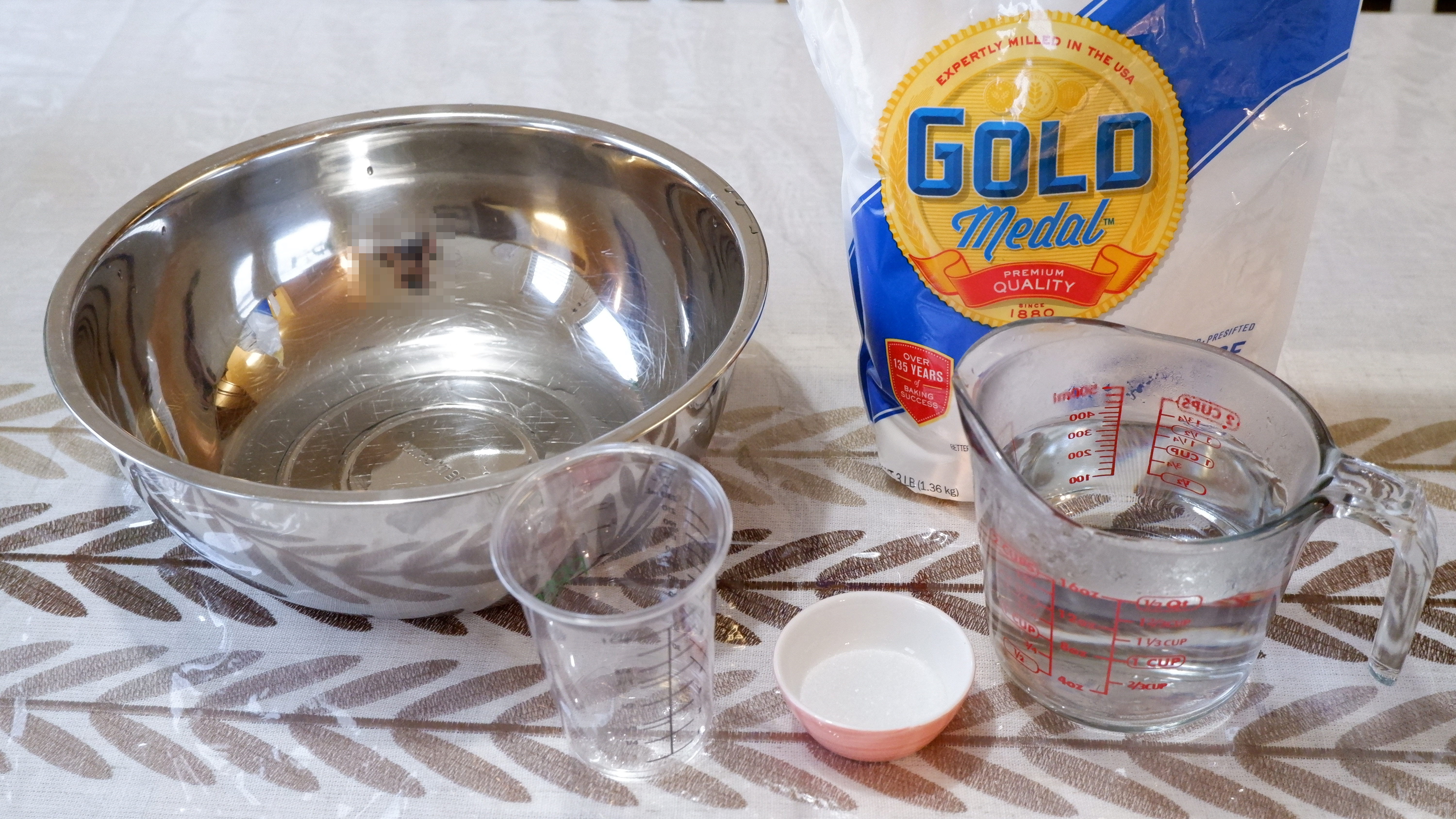 필요한 재료 : 밀가루 6컵(종이컵) , 뜨거운 물 400ml , 소금 , 식용유