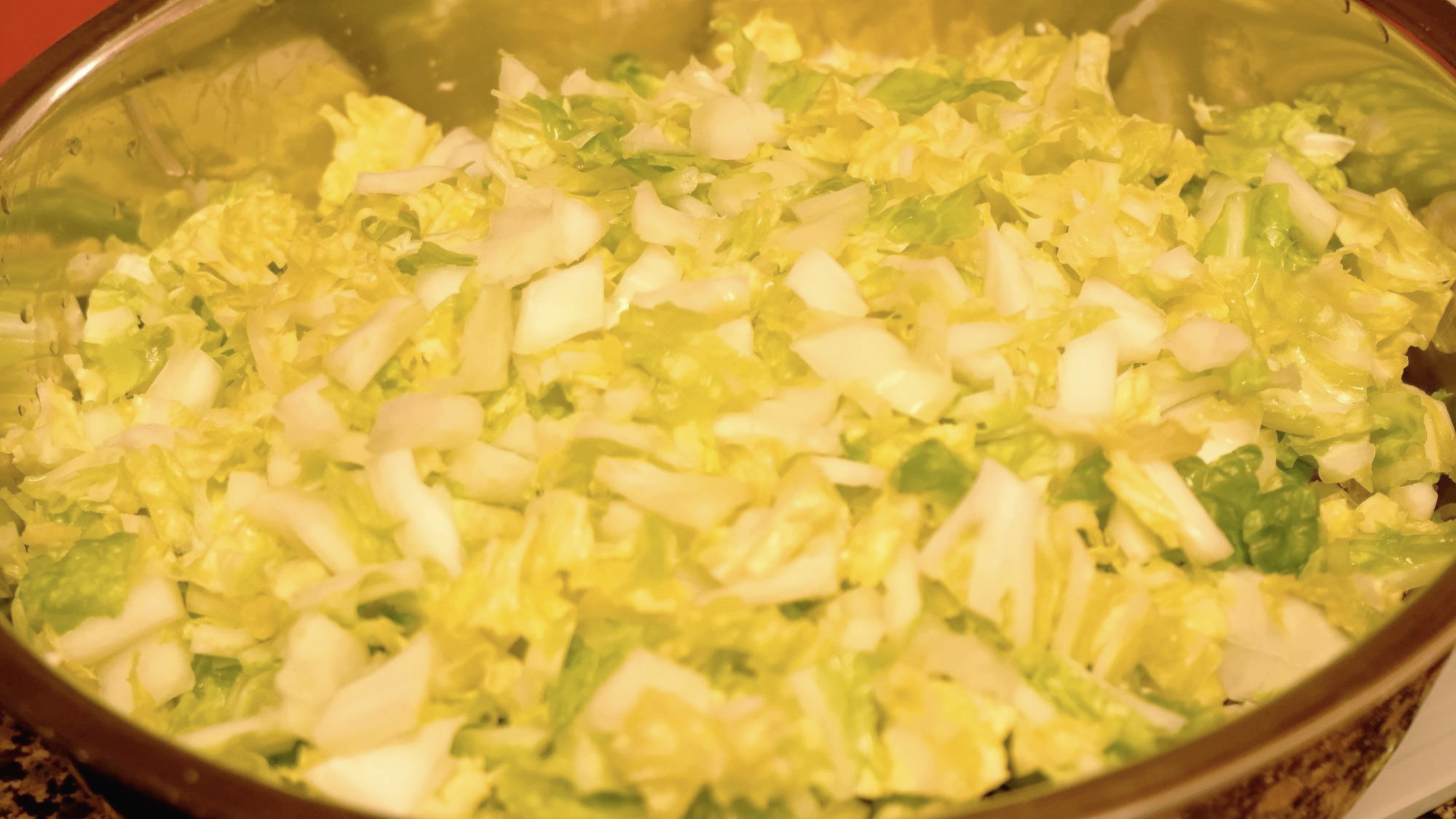 5. 알배추 반통은 잘게 썰어 천일염으로 30분간 절 여준 후 물에 헹구고 물기를 꾹 짜내 줍니다.