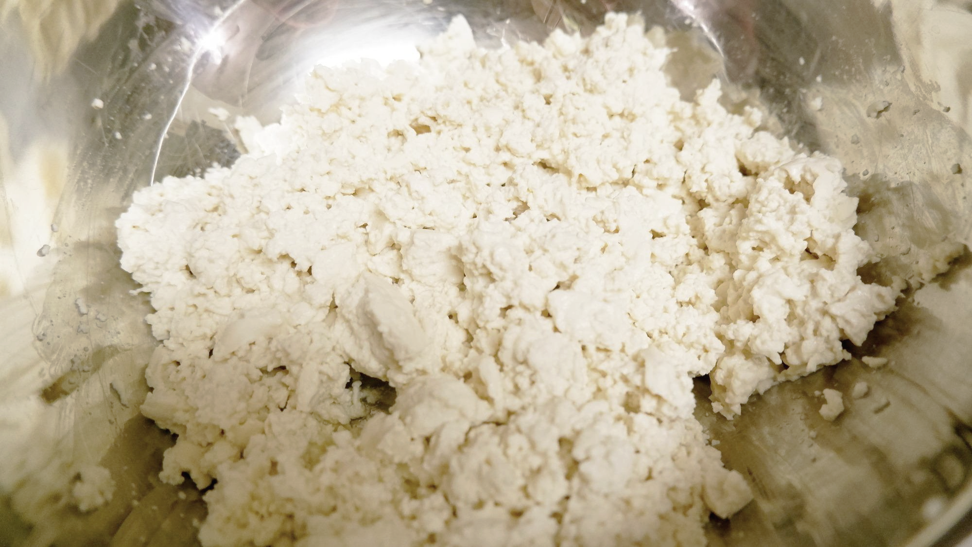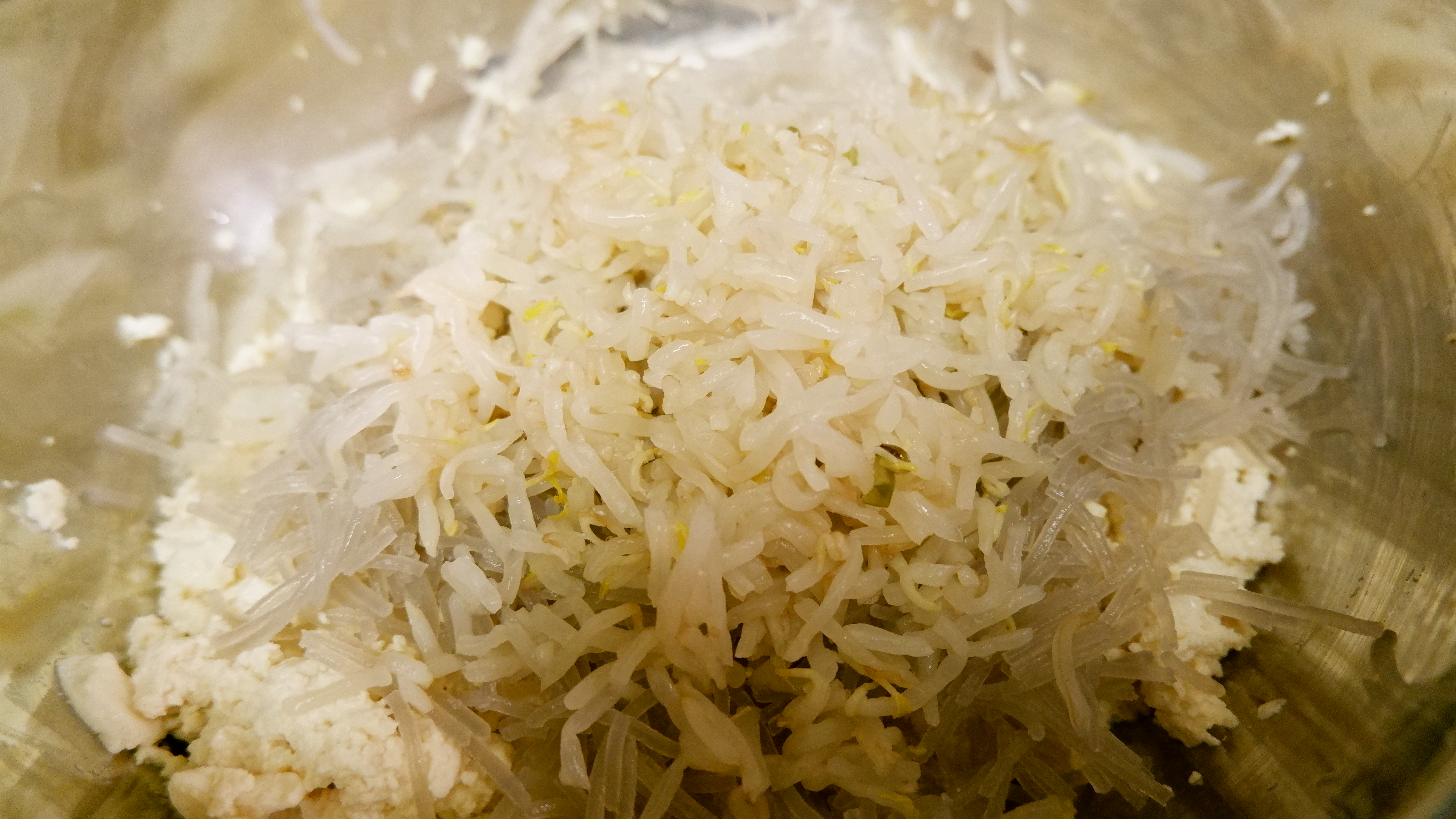 1. 두부 두모를 전자레인지에 넣고 3분 정도 돌려 물기를 빼주고 다시 한번 손으로 물기를 꾹 짠 후 으깨줍니다.
