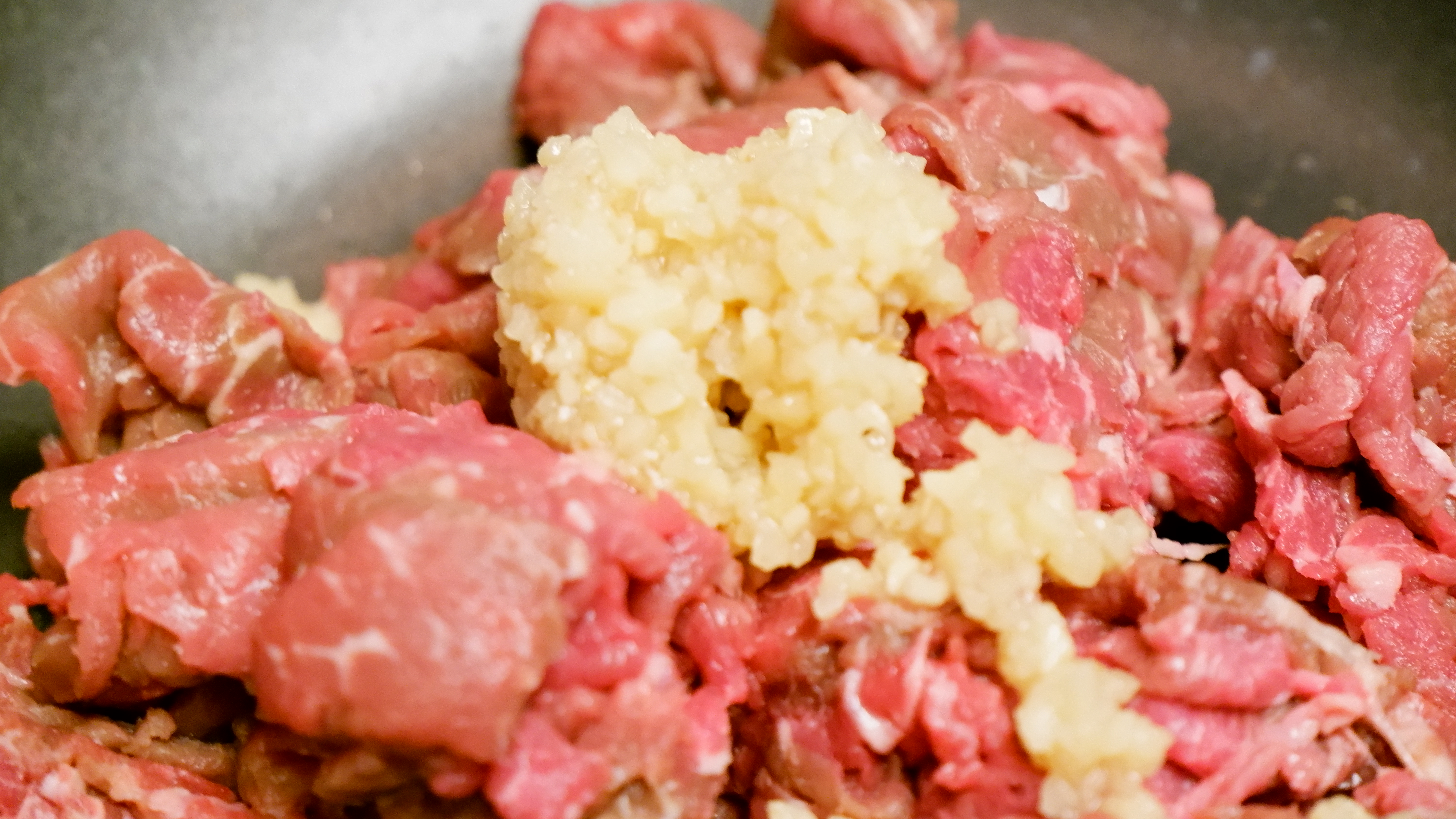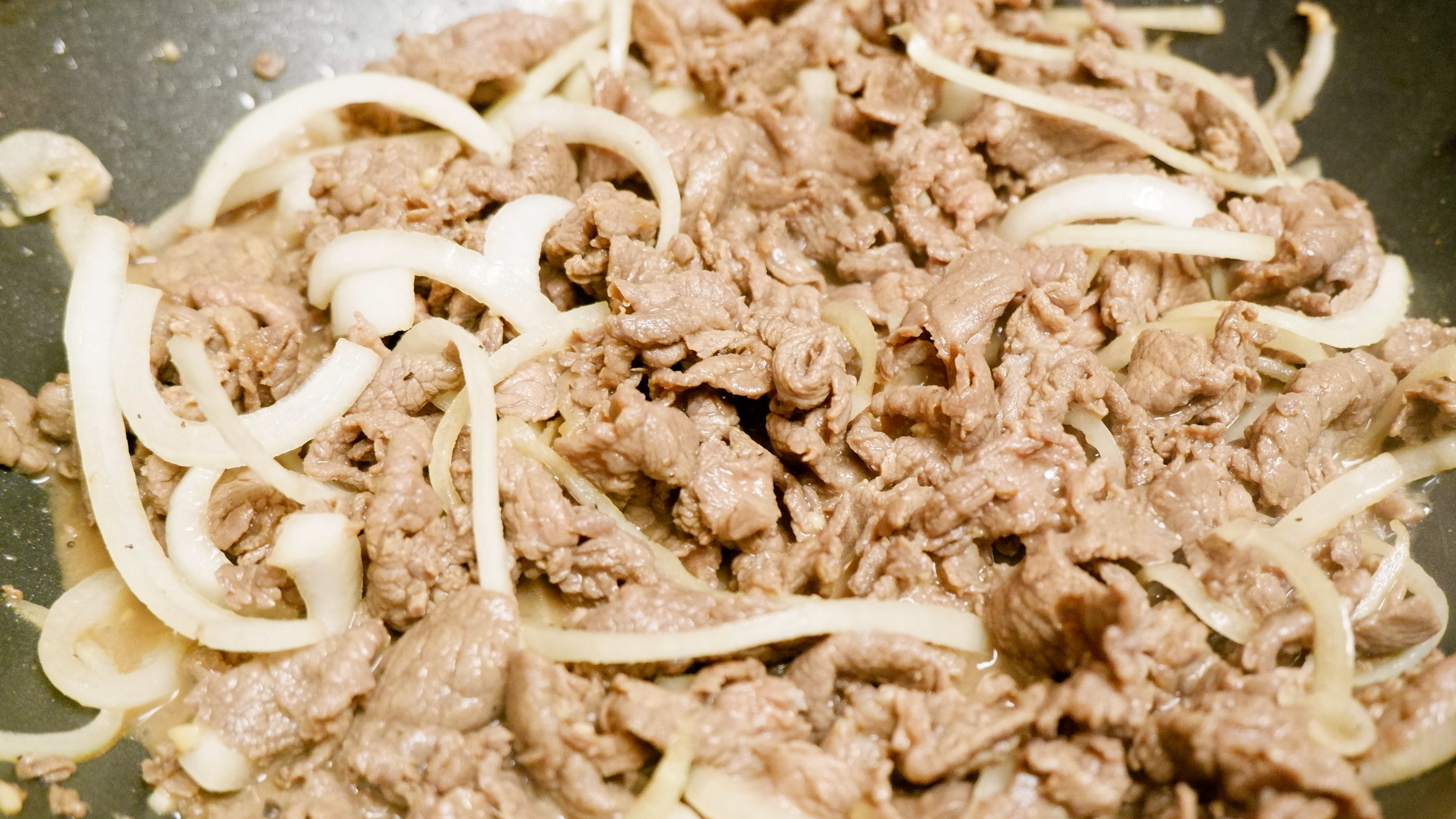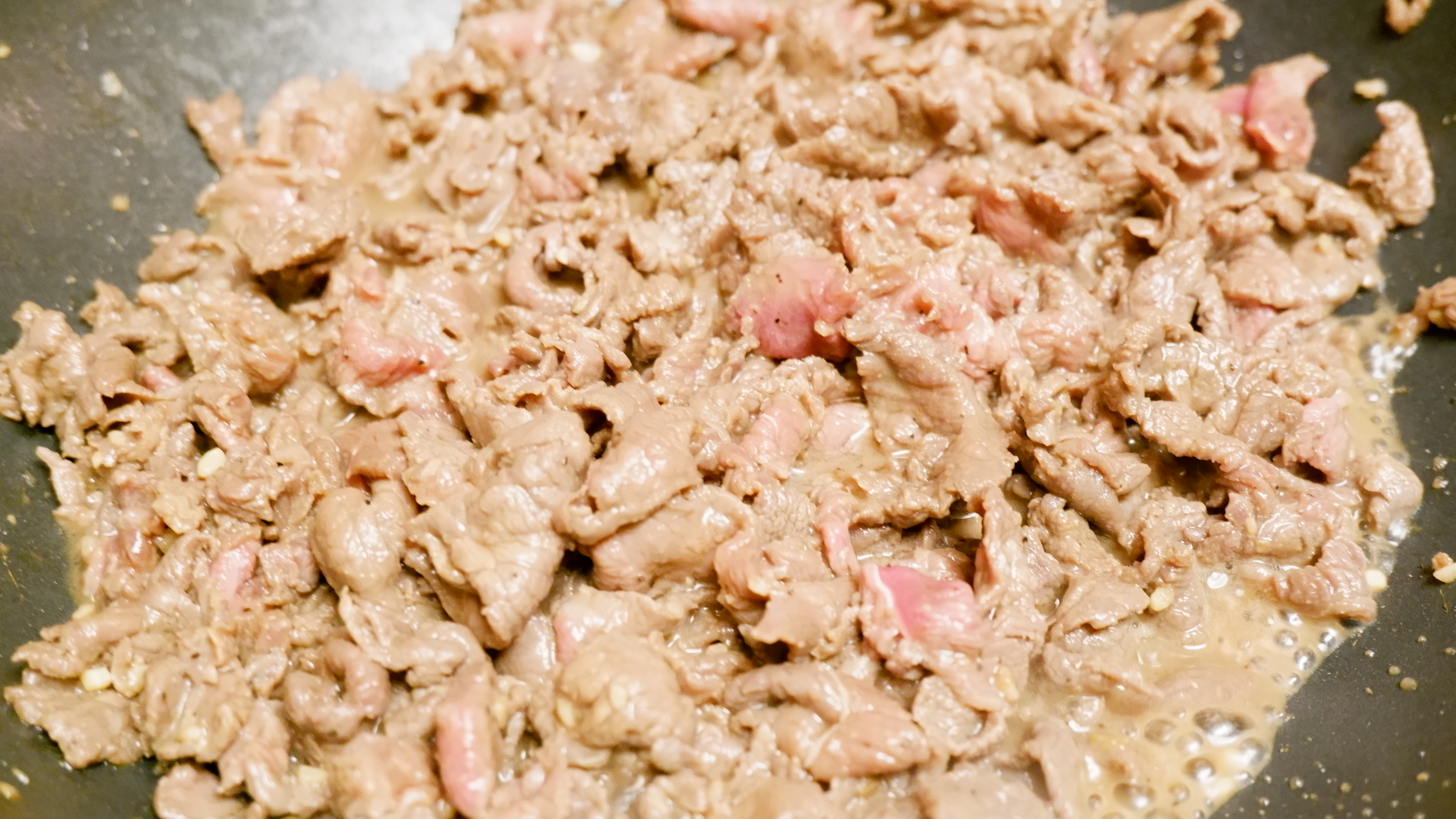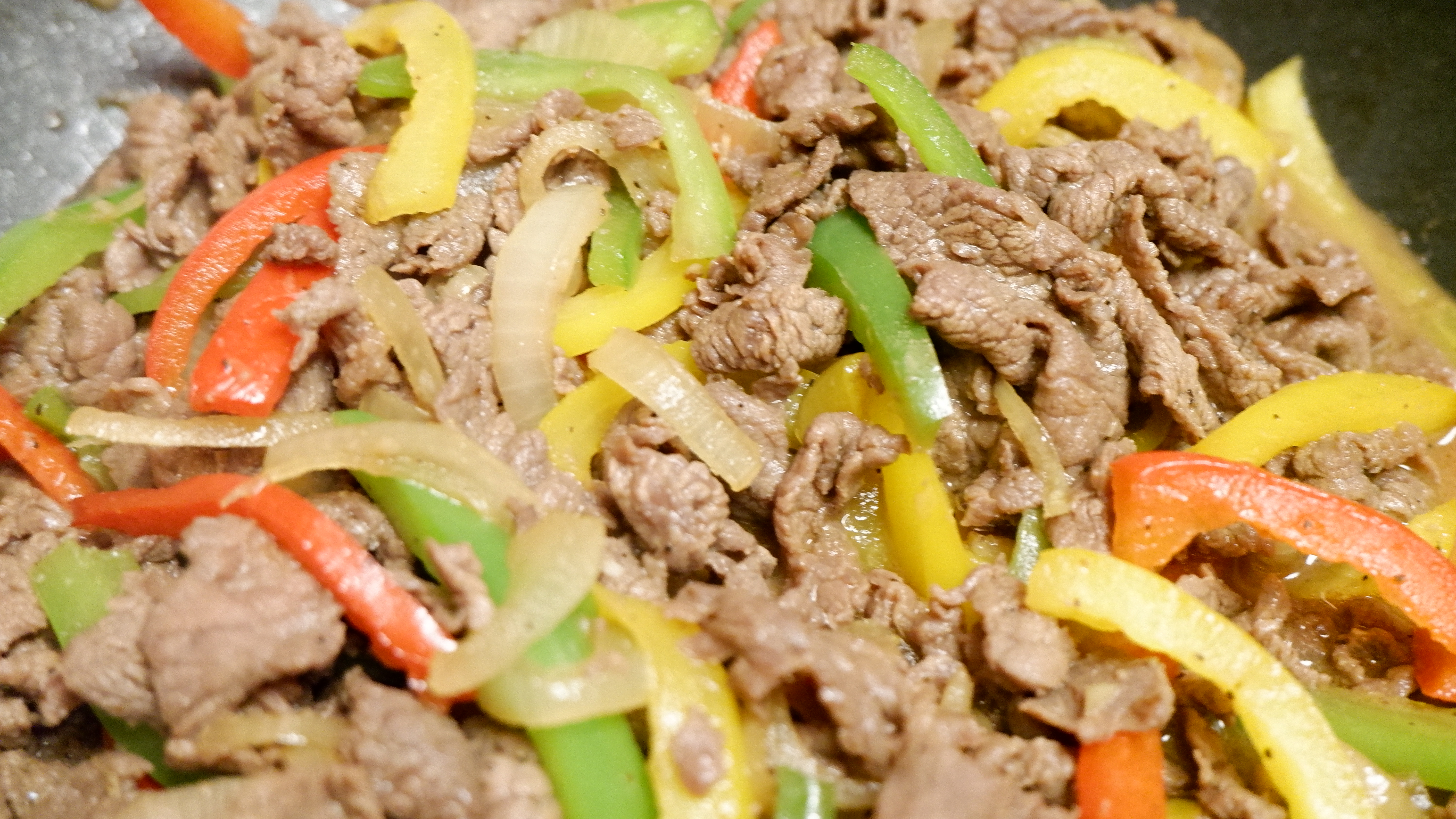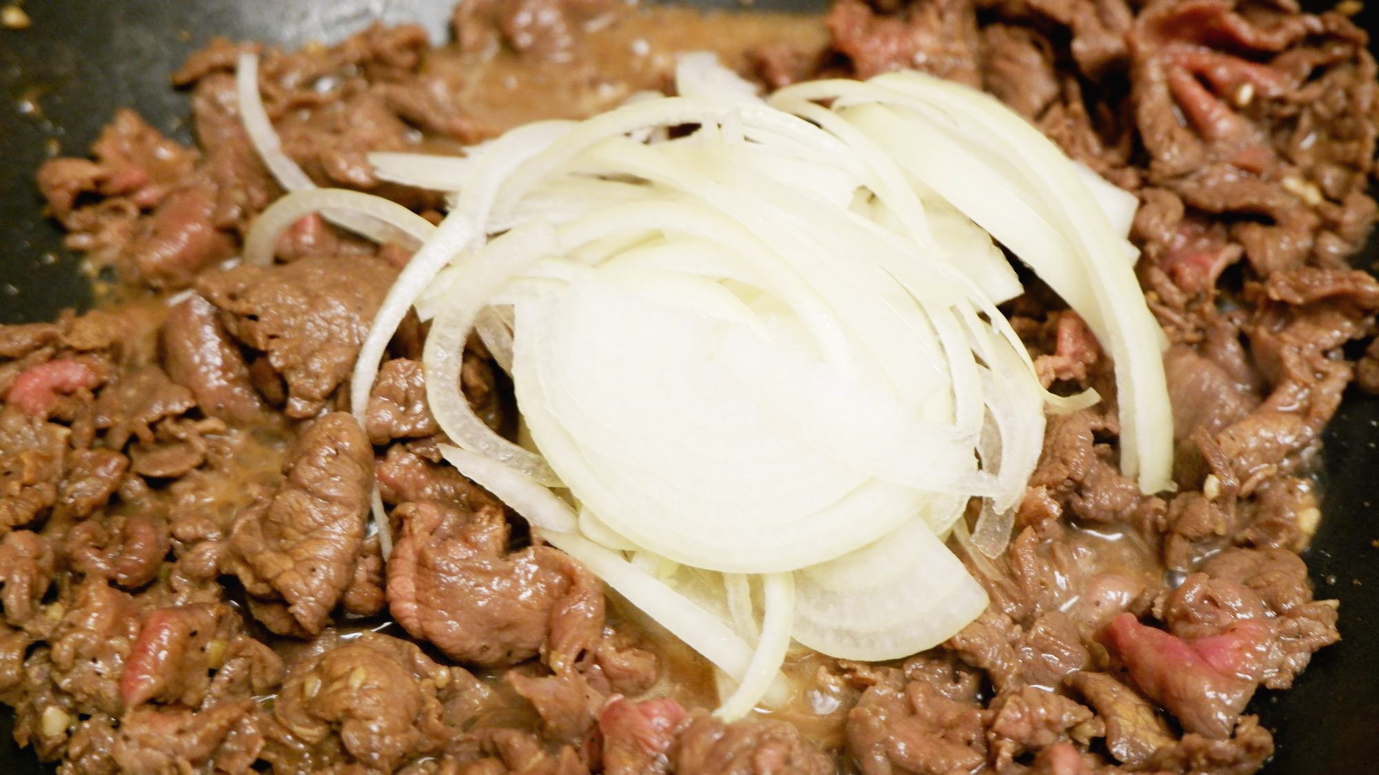 4. 프라이팬이나 웍에 양념한 소불고기를 넣고 중불과 센 불 사이에 맞춘 후 볶듯 익혀줍니다. 어느 정도 익어 갈 때쯤 채를 썬 양파를 넣고 2분 정도 볶다 마지막으로 피망을 넣고 2분 정도 볶아주세요!