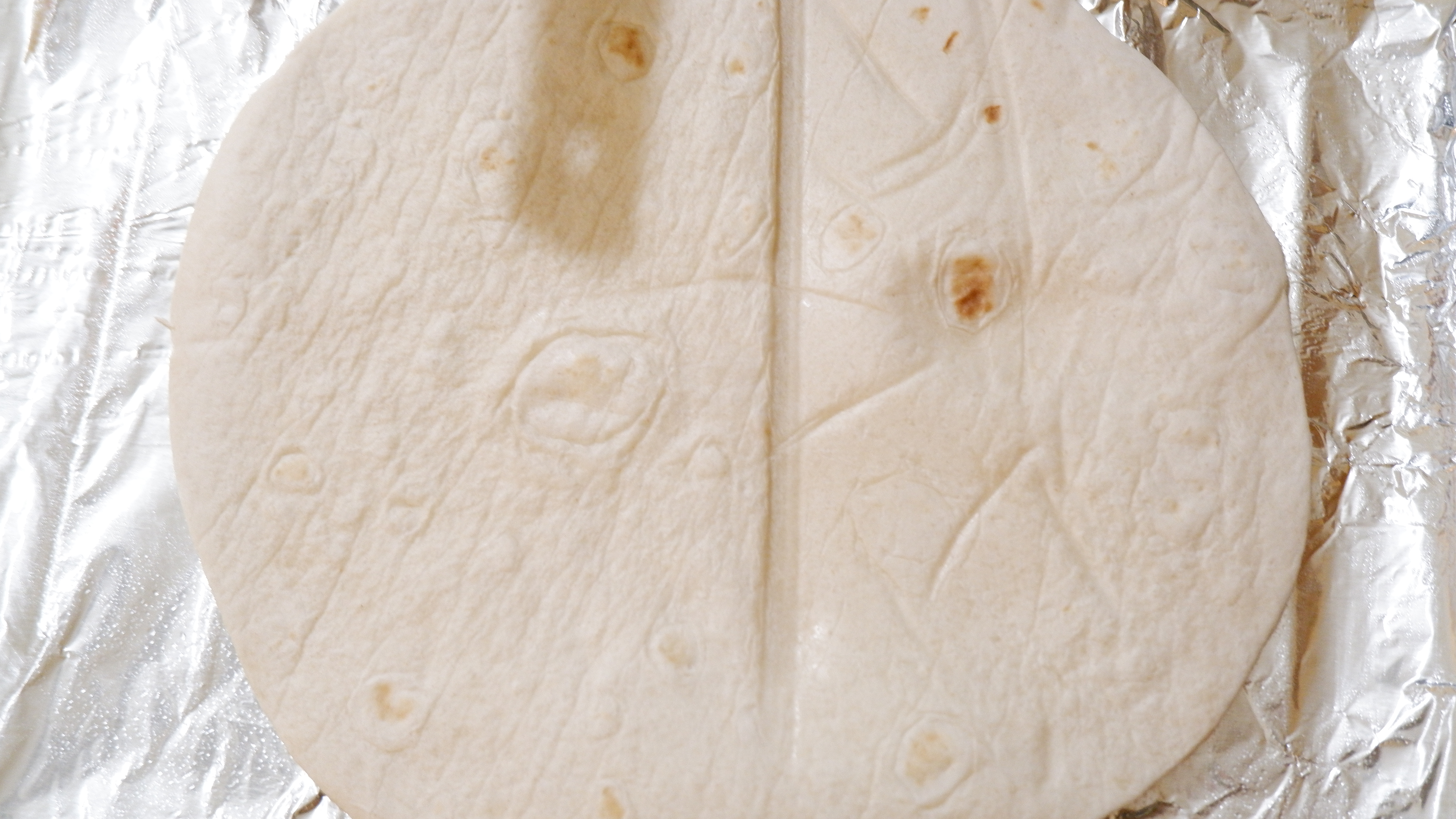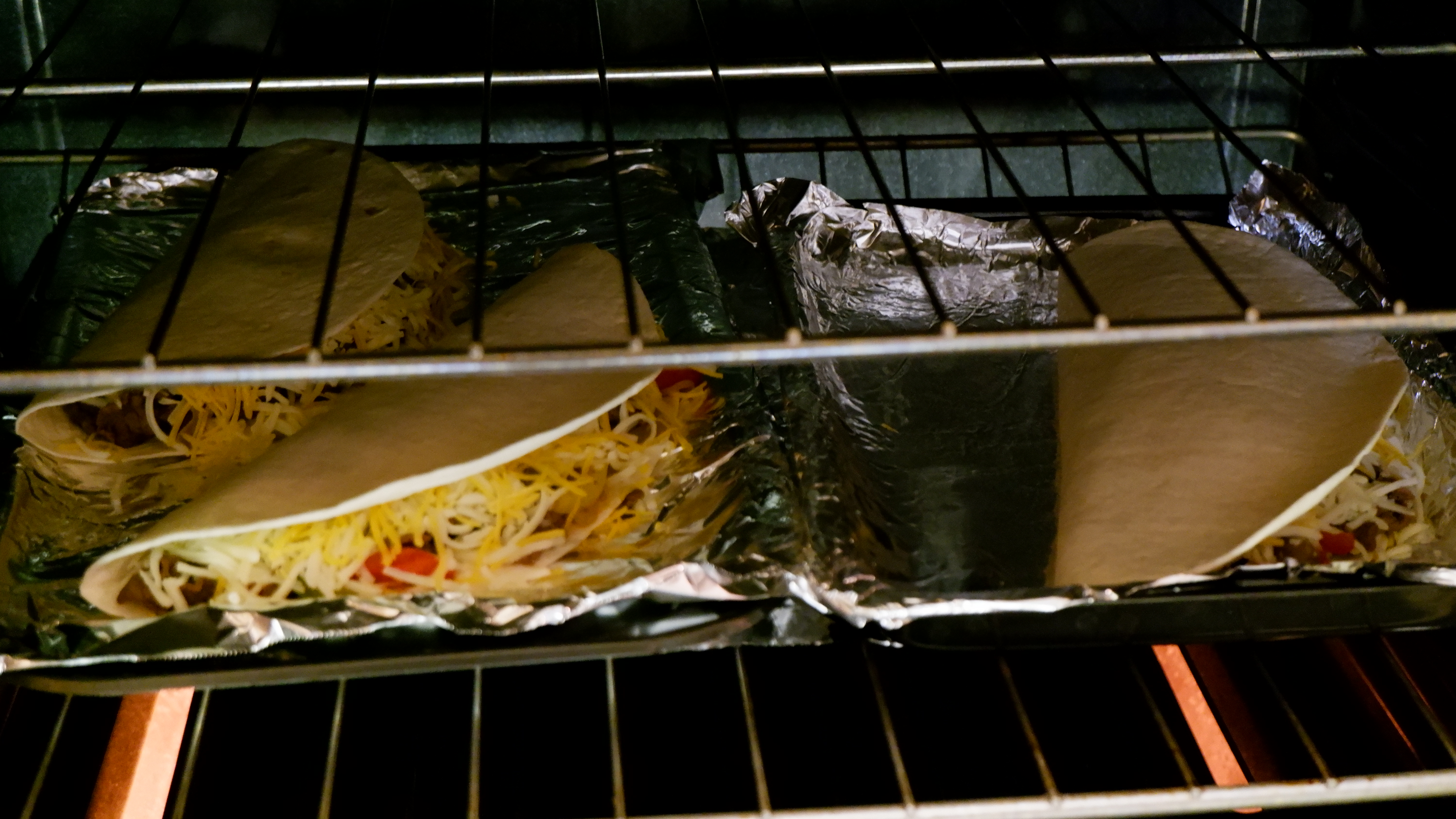 7. 오븐에 구울 경우 200도에서 15분간 구워주고 오븐이 없다면 프라이팬에 퀘사디아를 올리고 약불로 맞춘 후 뚜껑을 닫고 앞뒤로 노릇하고 치즈가 잘 녹을 때까지 구워주면 됩니다.