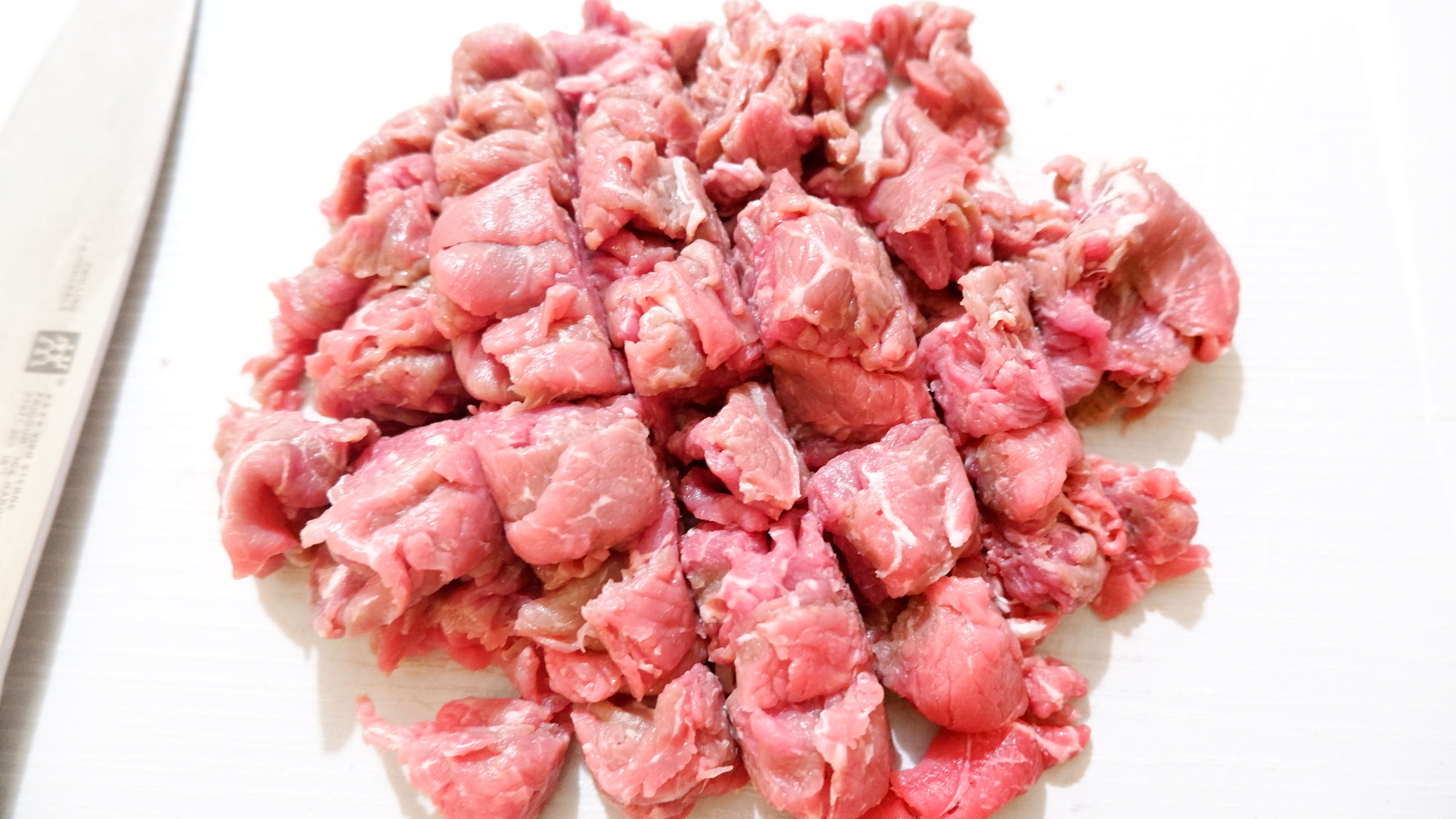 1. 먼저 소불고기용 고기(500g)가 너무 큼직하다면 먹기 쉽게 적당한 크기로 썰어줍니다.