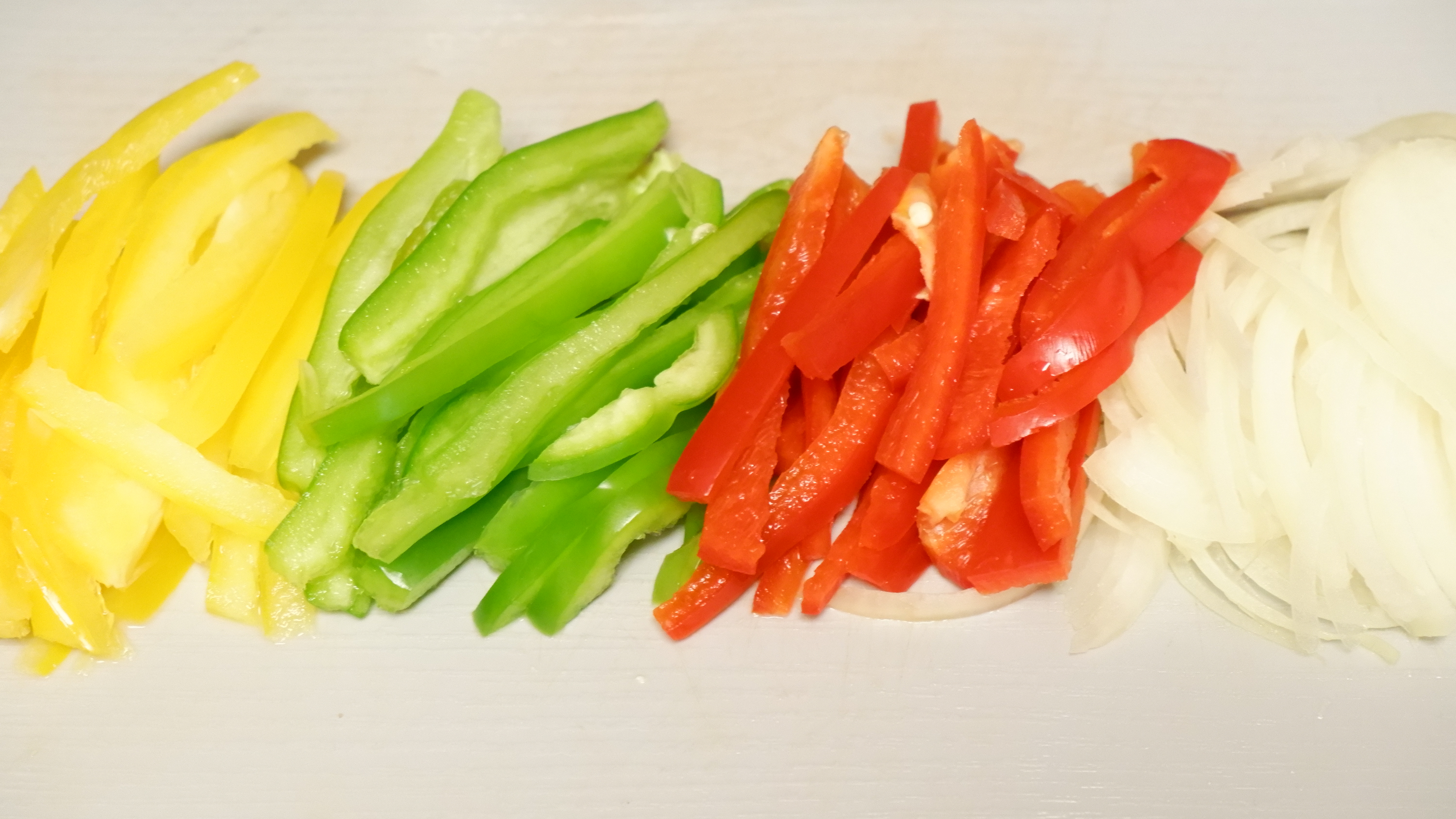 3. 피망 1개반 , 양파 1/2개는 손질 후 채를 썰어 주세요!