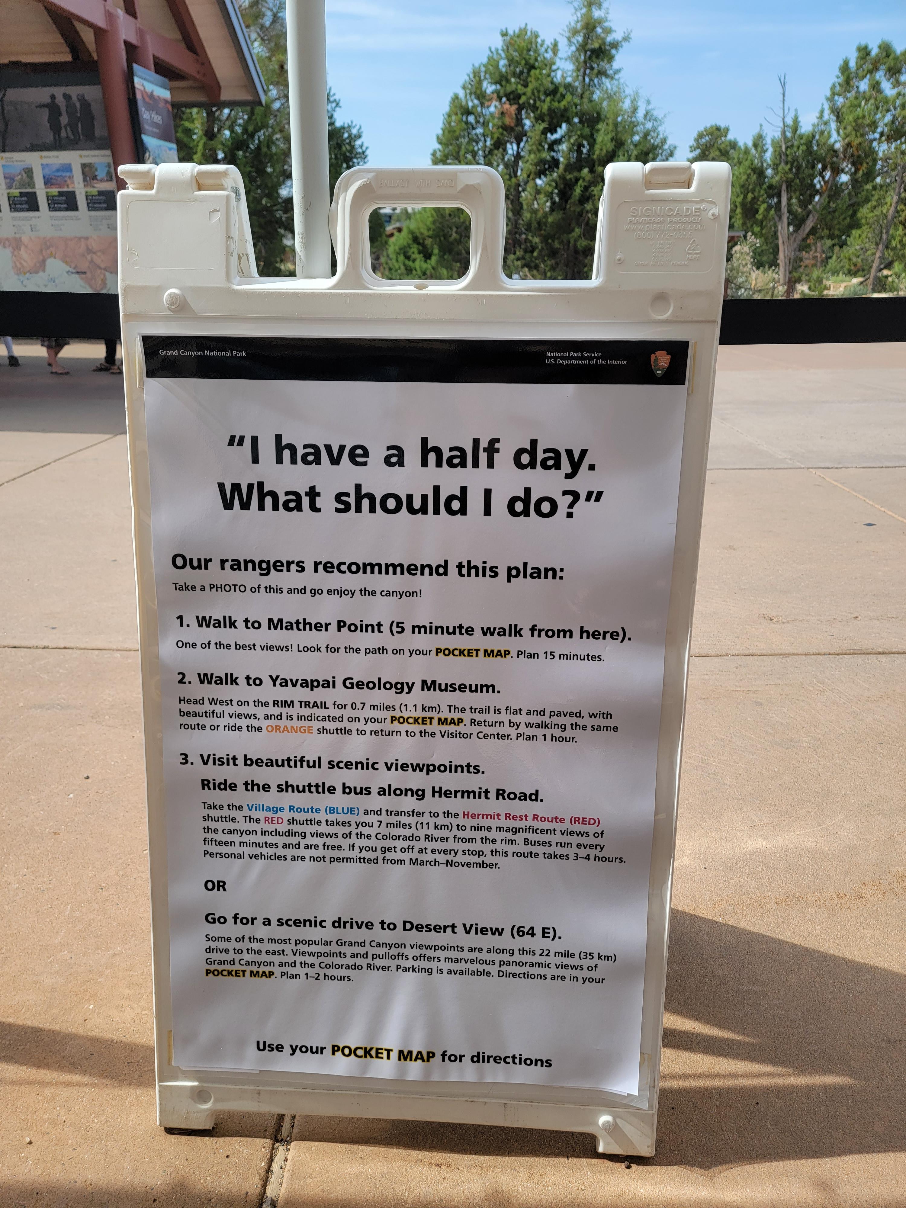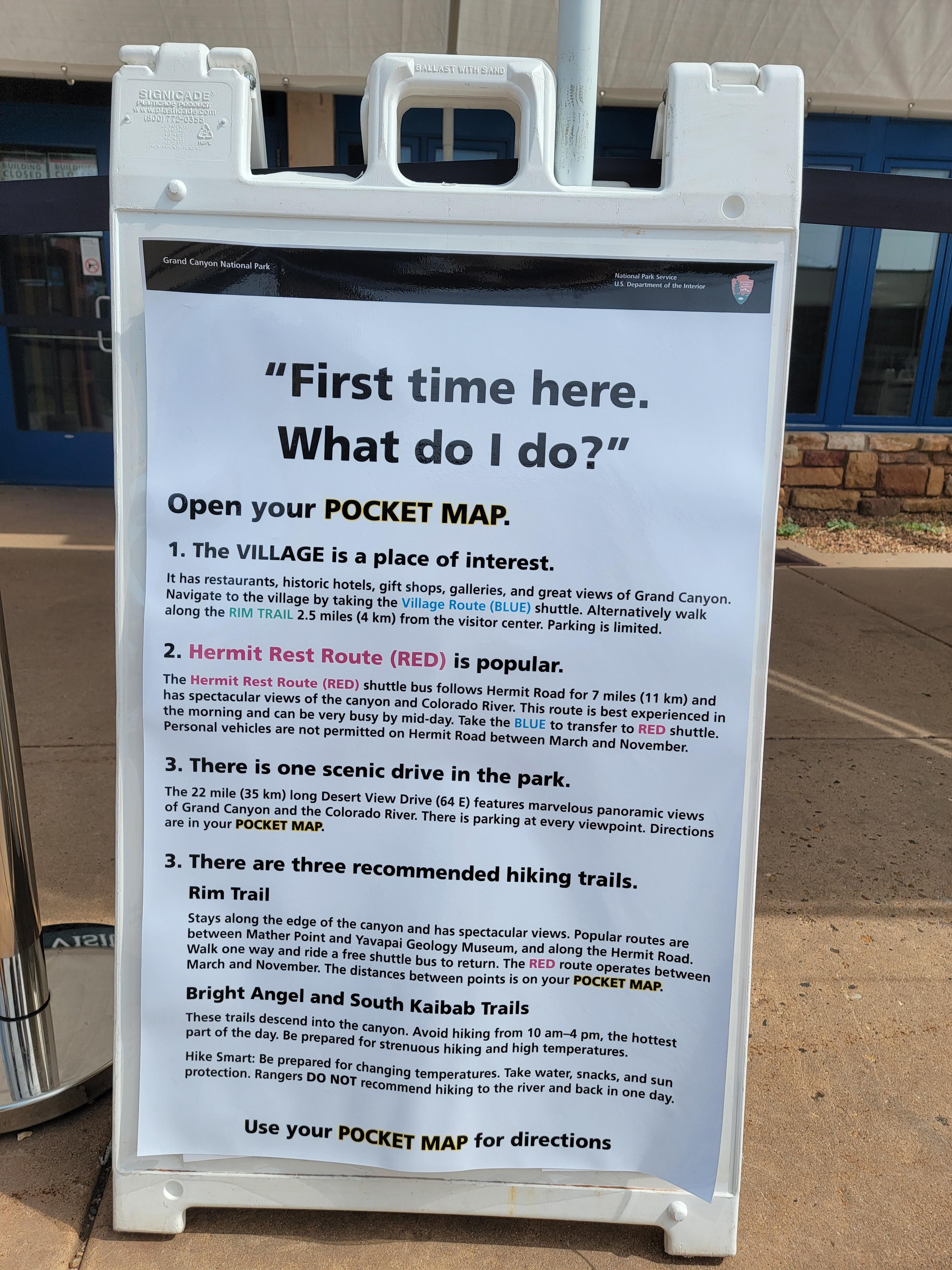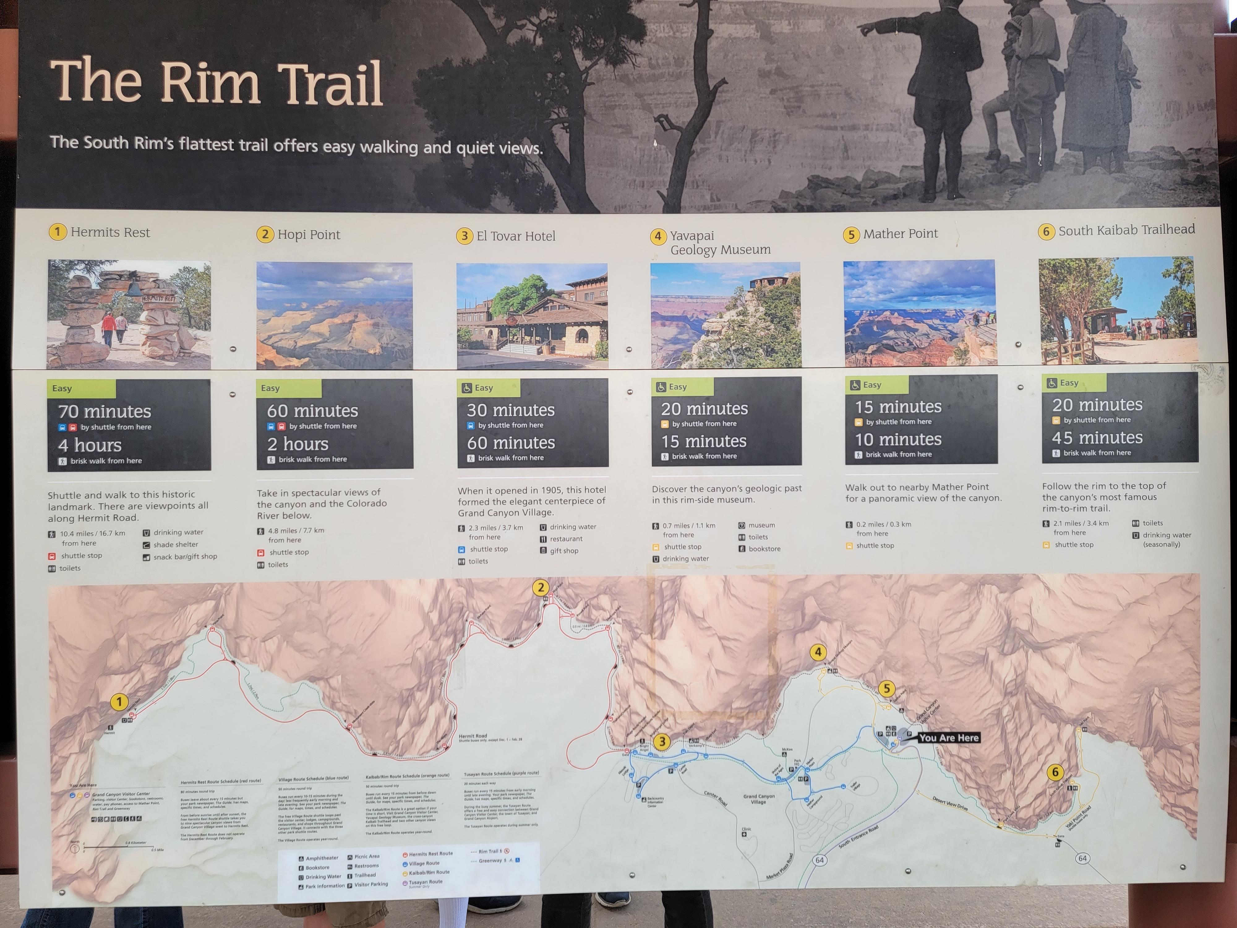 그랜드캐년에 도착을 해서 비지터 센터(Grand Canyon Visitor Center)로 가면 처음 방문하는 방문객들을 위해 친절하게 코스를 설명해주세요! 그래서 저희는 설명을 듣고 길지 않은 코스를 선택해서 트레일을 따라 걷기로 했어요~ (저희가 정한 코스는 Grand Canyon Visitor Center -> Hopi point까지 트레일을 따라 걷기로 결정!)