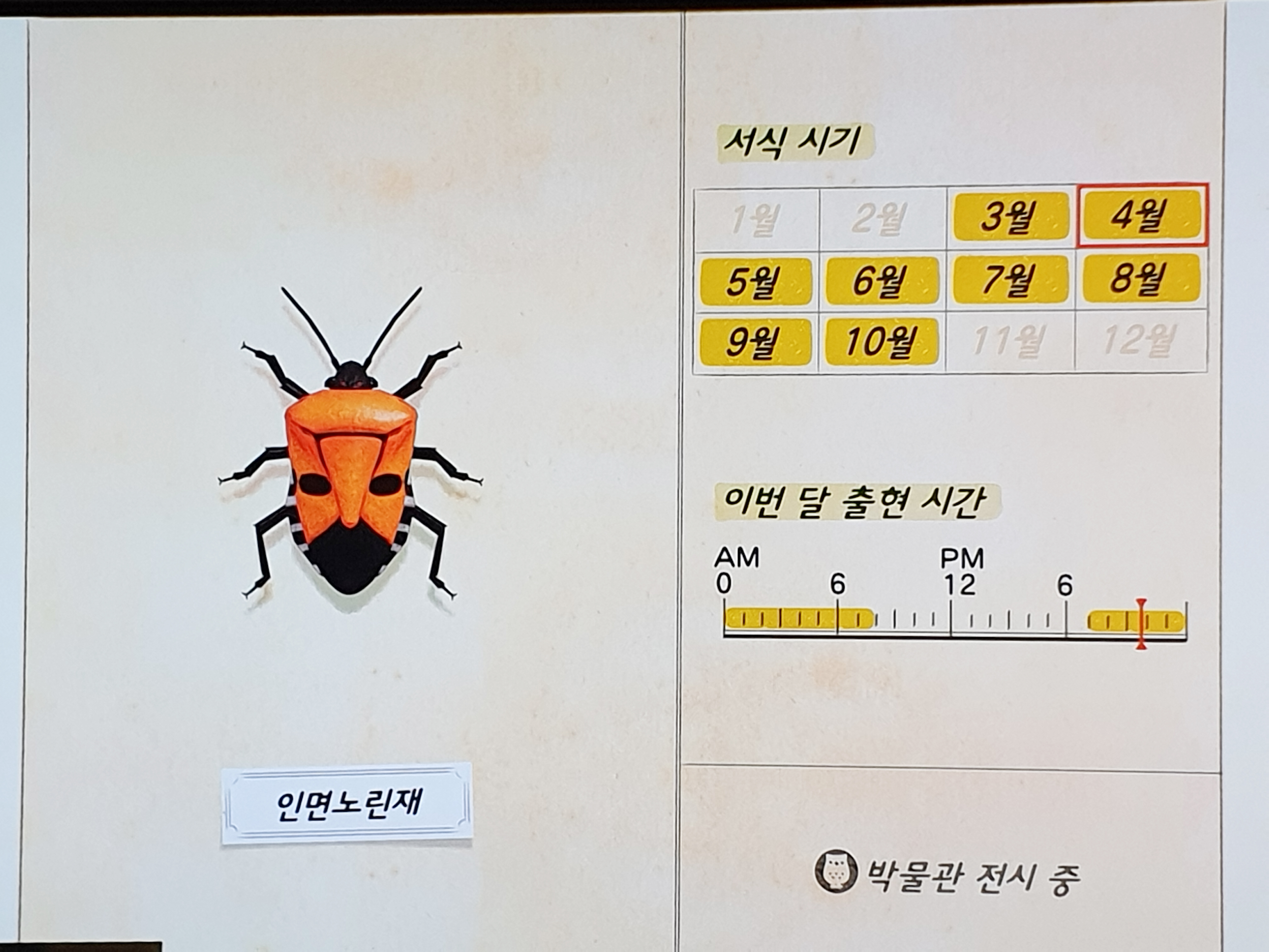 인면노린재 서식 시기는 3월~10월이고 출현 시간은 7 PM~ 8 AM입니다.