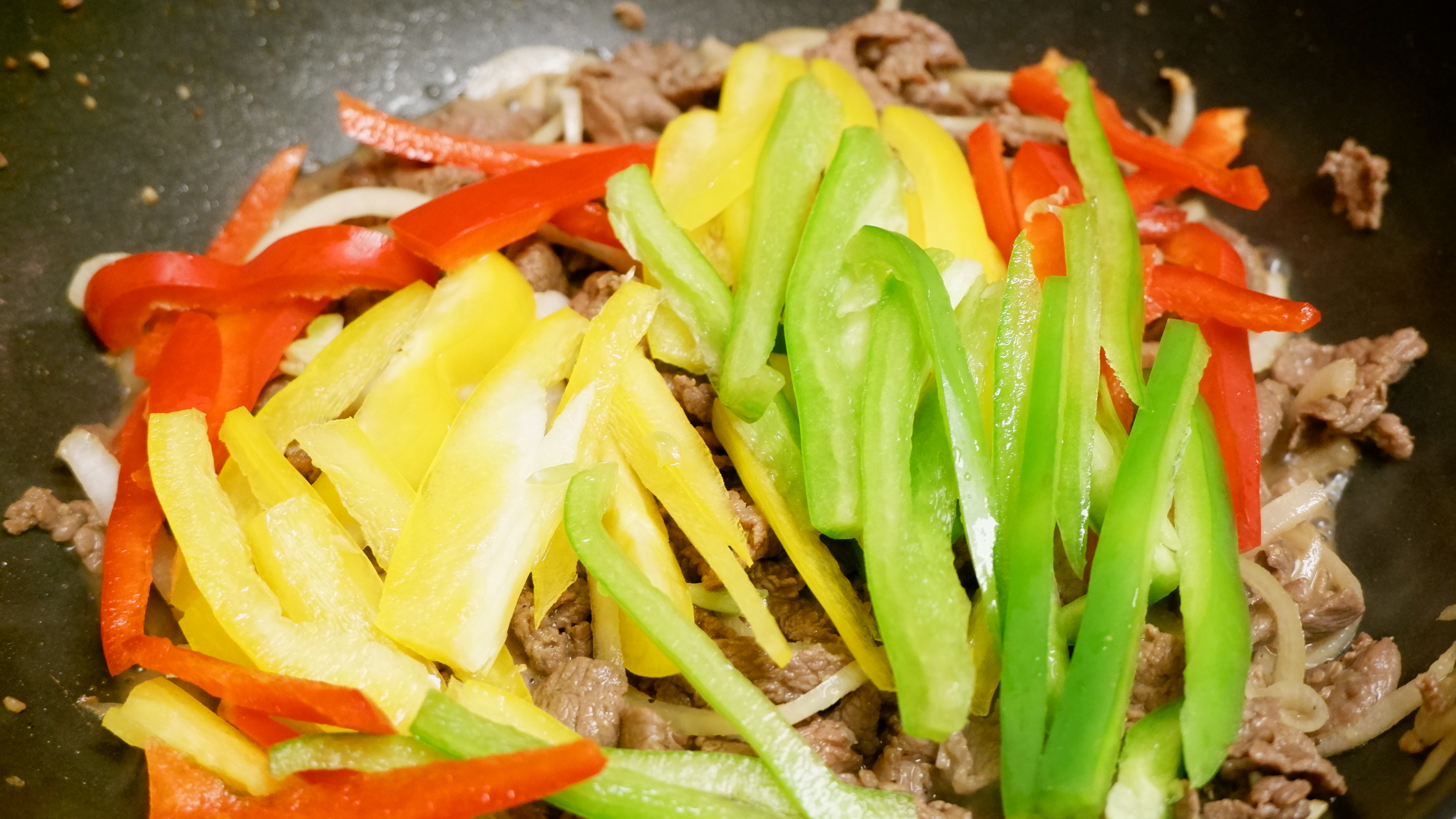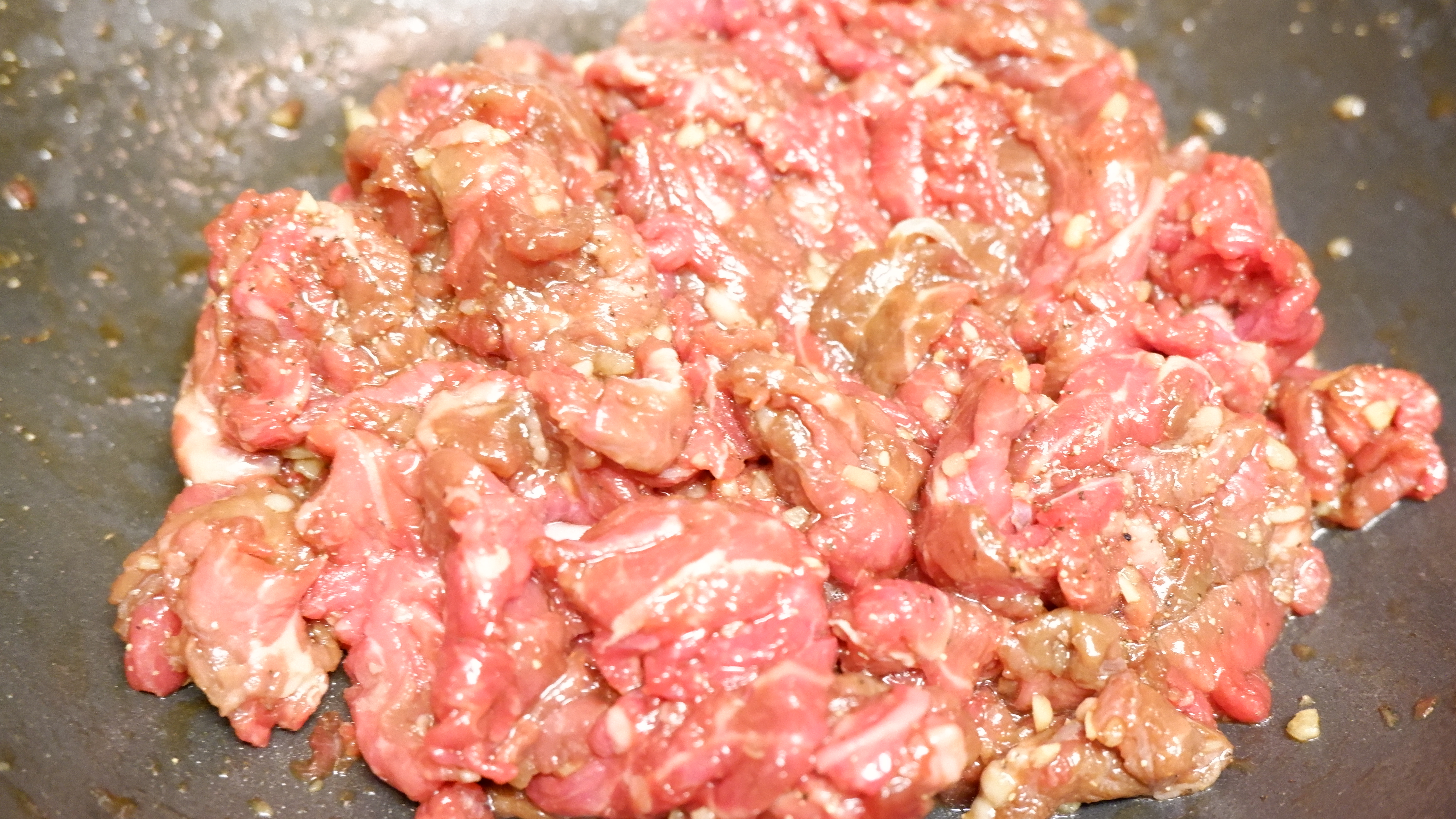 4. 프라이팬이나 웍에 양념한 소불고기를 넣고 중불과 센 불 사이에 맞춘 후 볶듯 익혀줍니다. 어느 정도 익어 갈 때쯤 채를 썬 양파를 넣고 2분 정도 볶다 마지막으로 피망을 넣고 2분 정도 볶아주세요!