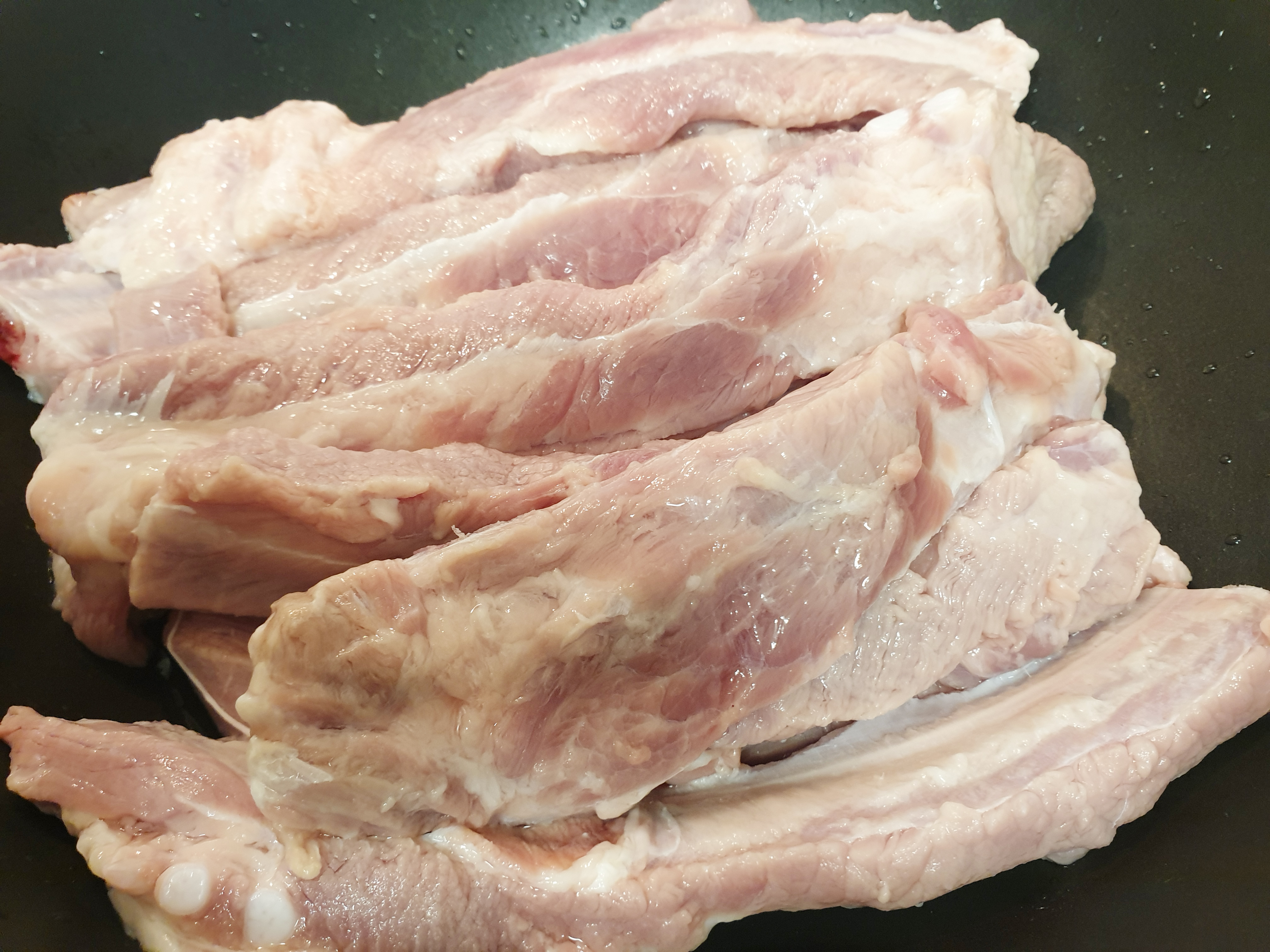 재료가 준비됐다면 냄비에 등갈비를 넣고 물 한컵 반을 부어준 뒤 설탕 2스푼, 간장 8스푼, 다진 마늘 1스푼, 채 썬 양파를 넣어주고 고기가 어느 정도 익을 때까지 중불에 맞춰 끓여주세요~!
