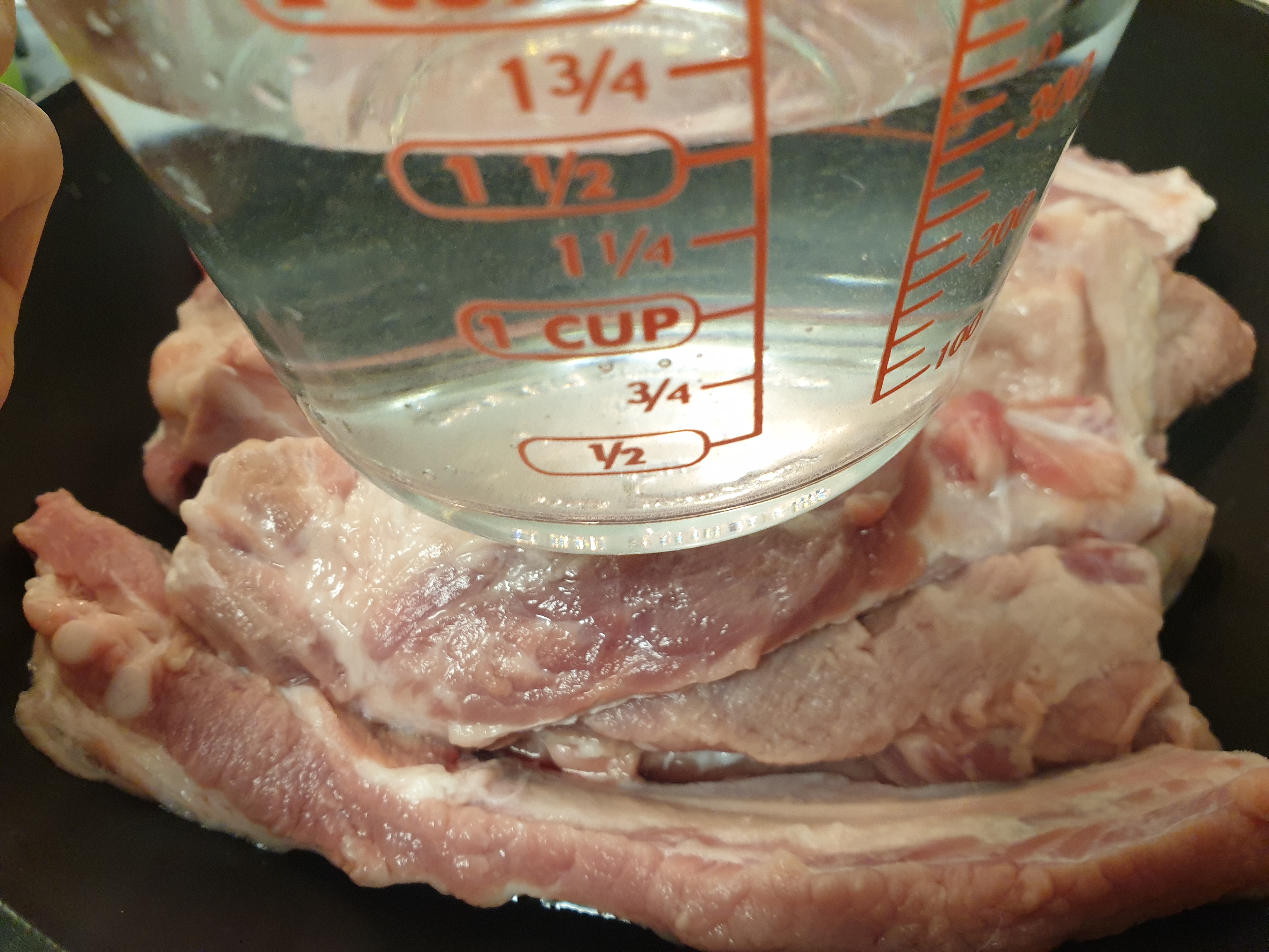 가장 먼저 매운 등갈비찜을 만들기 위해서 등갈비 핏물을 빼고 손질을 해줘야 해요~ 우선 등갈비 핏물을 뺄 때는 등갈비가 충분히 잠기도록 물을 부어주고 잡내를 잡기 위해 청주나 소주 1컵(소주잔)을 넣어준 뒤 2시간 이상 핏물을 빼줍니다. 그다음 흐르는 물에 씻어준 뒤 손질을 해주는데 등갈비 안쪽에 있는 근막을 벗기고 갈빗대 사이사이를 잘라 준비해주세요! (근막을 제거하는 이유는 근막이 질기기 때문에 식감이 좋지 않아요!) 그리고 감자 3과 양파 1껍질을 벗긴 뒤 감자는 큼지막해 썰어 준비해주고 양파는 너무 얇지 않게 채를 썰어 준비해주세요