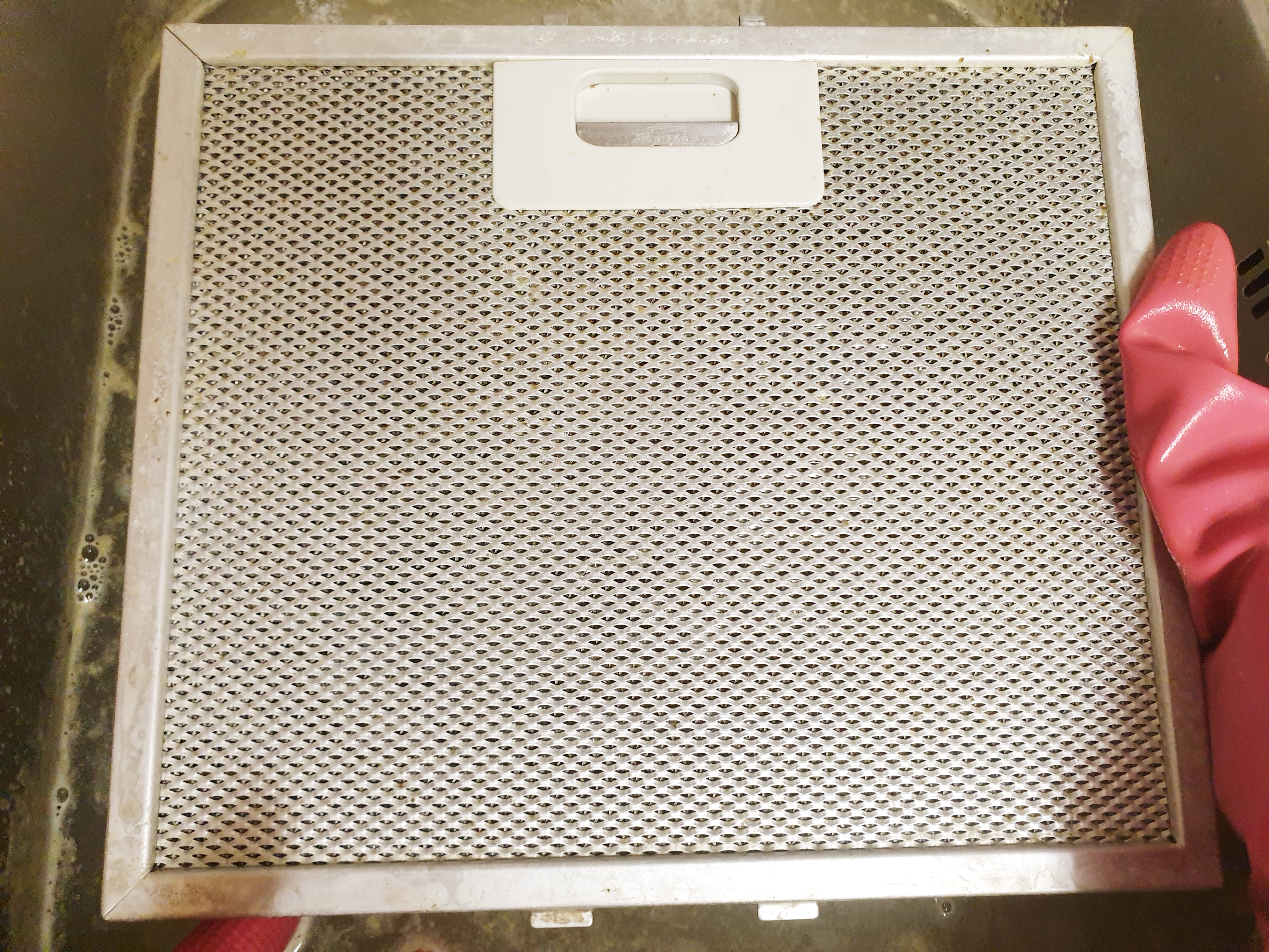 후드 필터를 들어 보면 이렇게 기름때가 제거되어있는 모습을 볼 수 있습니다. 힘 하나도 안 들고 기름때 제거!